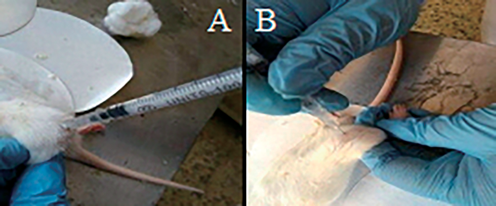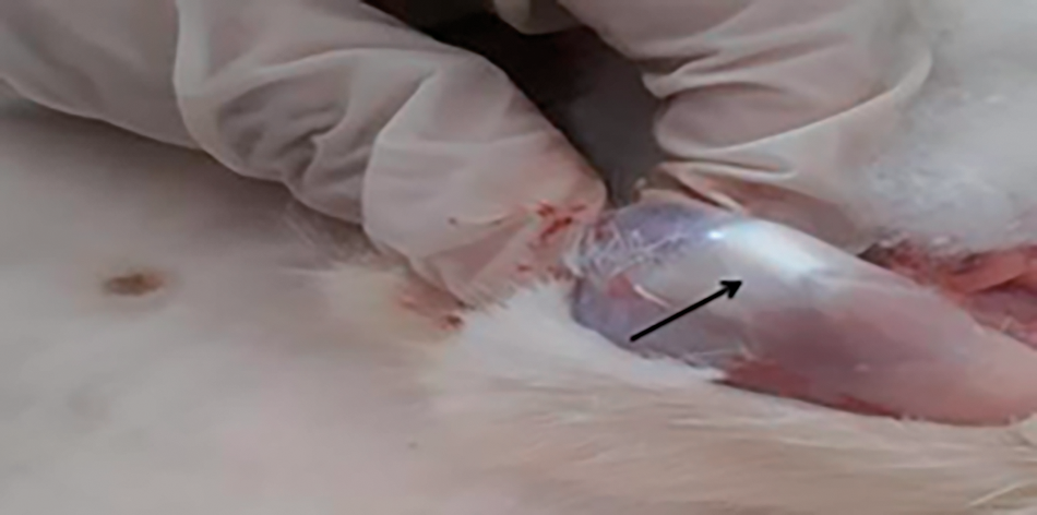 Total number of male rats (89) of Rattus norvegicus were used and divided into three groups; each group was anesthetized (before injection) with ketamine: xylazine (2:1) (Muratet al., 2007; Schmitzet al., 2010). The first group was regarded as a control group, which was composed of 19 rats injected with 0.5 ml of normal saline (0.9%) at right knee joints. The second group (OA induced) consisted of 35 rats injected with papain enzyme at a dose of 10 mg at the intra-articular region of the right knee picture (Fig. 1). The treated group also consisted of 35 rats, which were firstly injected with papain enzyme at a dose of 10 mg then, after two weeks of injection, they were treated the rats with vitamin D, which was prepared according to Schmitzet al. (2010), each rat was injected with 0.6 μg/kg of vitamin D in the intra-articular region. The treatment period extends to two weeks, with one injection every week. All studied groups were sacrificed after 28 days from the beginning of the experimental design.