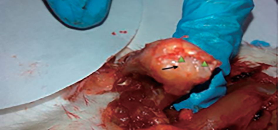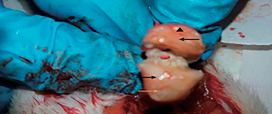 Fig. 6. Macroscopic observation in (OA) rat model showed knee joint, severe destruction and destruction () of articular cartilage surface, rough and irregular separation () between the condyles.