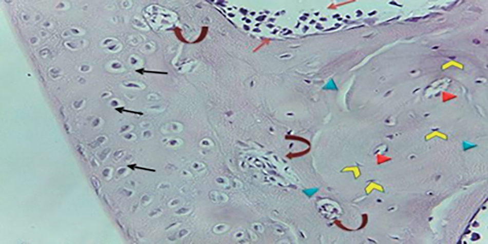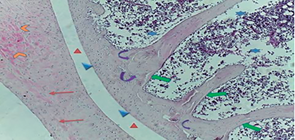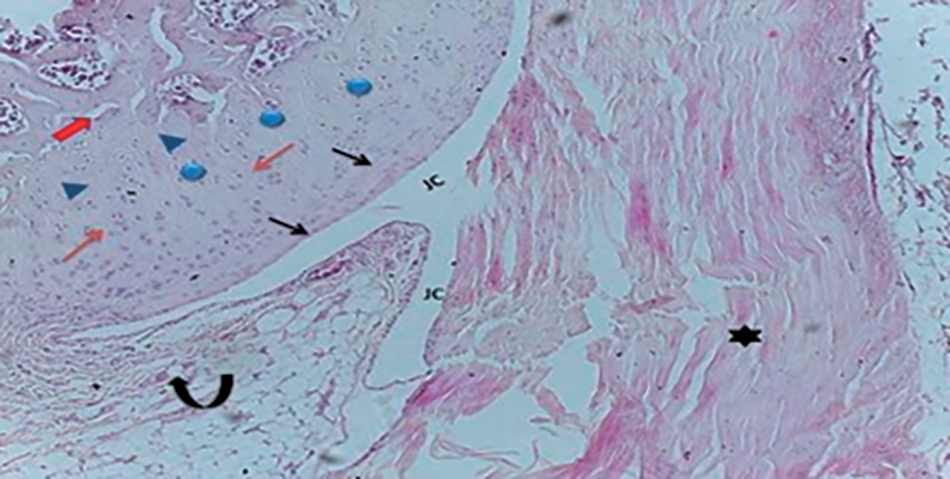 Results from papain injected knee joints revealed that an articular space was damaged, extensive degeneration, most chondrocytes lost the normal cellular morphology, narrowing the joint cavity between femoral condyles and tibial epiphyseal plate, rough surface, irregular discontinuity of superficial layer, condensation, proliferation of chondrocytes, cells death until the mid-zone of cartilage, moreover hypercellularity, disorientation of chondrocytes columns and formation of chondrocytes clusters (Fig. 11).