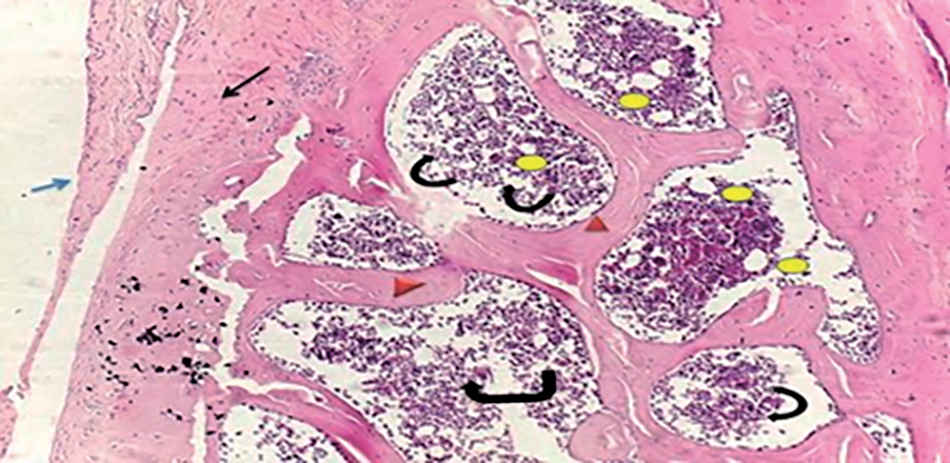 Sections from OA rats treated with vitamin D post 28 days showed normal chondrocytes, continuity of ECM, the subchondral bone differentiation to trabeculae, normal marrow cavities, foci of proliferation osteoblast, and there was the remodeling of compact bone that osteon appear at the deep region of epiphyseal plate growth, this result considered that vitamin D might increase the synthesis of ECM, control the mechanism between catabolism and anabolism, or stimulate secretion of growth factors and activated the chondrocytes proliferation. Recorded findings suggested that vitamin D enters the bloodstream and travels to tissues possessing vitamin D receptors (VDR) such as bone, bone marrow, and chondrocytes, and the binding leads to promoter of various target genes and the activation of (VDRs) results in the absorption of calcium to regulate the circulating levels of calcium and phosphate for normal mineralization of bone (Guillotet al., 2010; St-Arnaud & Naja, 2011; Bachet al., 2014).