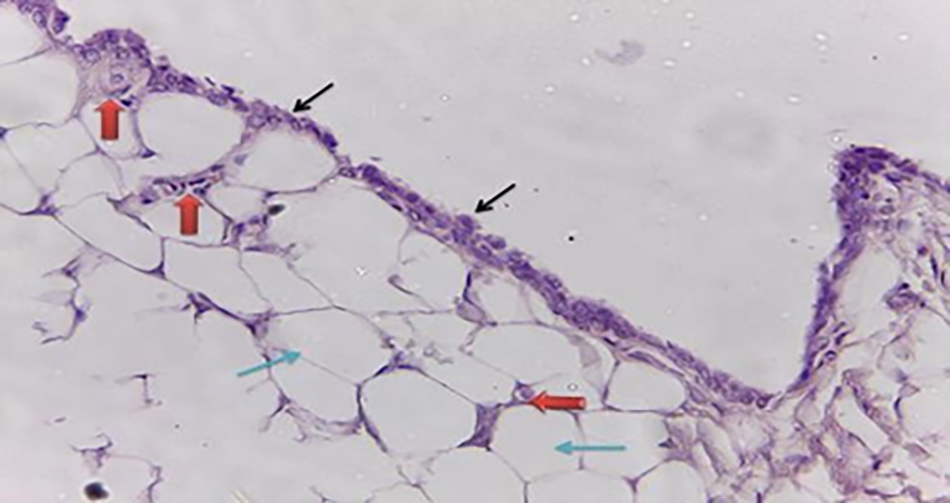 Fig. 10. Section from normal rat knee joint showing structure of synovium tissue, composed of special cells (type A) known synoviocytes () or synovial lining cells, and inner layer of adipose tissue (), synoviocyte (type B) (). (H & E) stain.