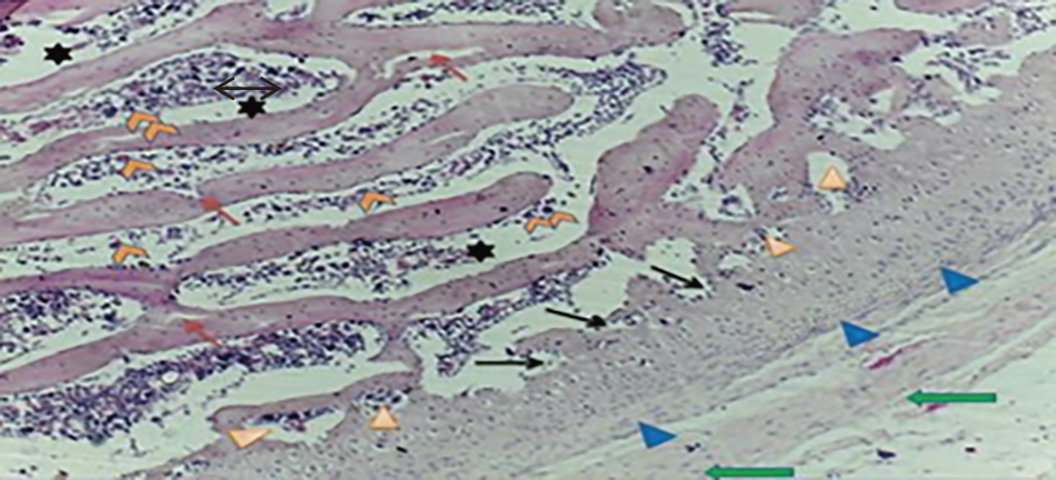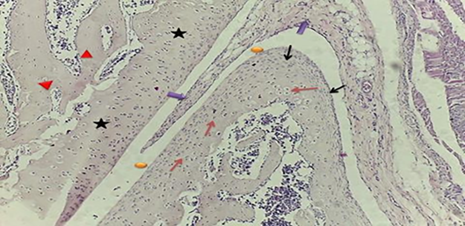 Fig. 15. Section from (OA) rats treated with vitamin (D) showing normal hyaline cartilage () at the joint region, the epiphyseal plate () with more regular chondrocytes (), normal joint cavity (), the subchondral bone formed trabeculae () surrounded the marrow cavity () with mild inflammation, small osteon centers () were noticed and continuity of cartilage matrix () noticed. (H & E) stain.
