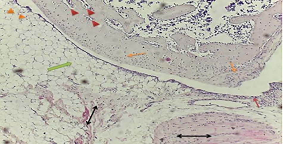 Fig 12. Section from (OA) rat at tibia plateau region showed moderate to severe synovitis (), discontinuity of synovium (), extensive chondrocytes degeneration (), foci of aggregated chondrocyte () noticed, expanded adipose tissue () with fibrous connective tissue (). (H & E) stain.