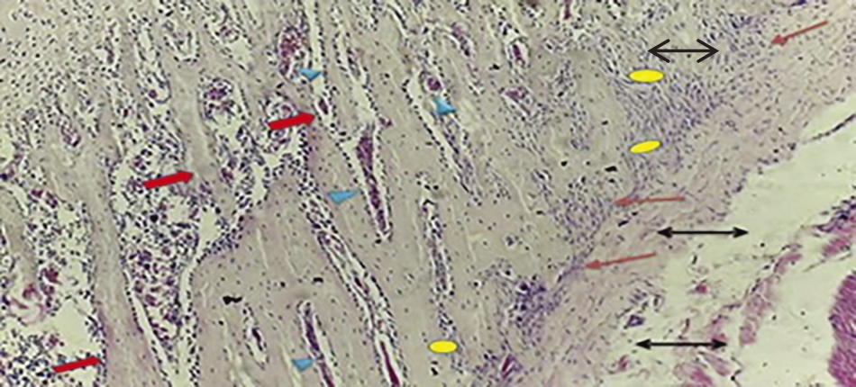 Fig. 13. Histological section from (OA) rat articular cartilage shows denudation and complete degeneration of cartilage surface (), hyper-proliferation of inflammatory cells (), collapsed subchondral trabeculae () enclosed congested, cellular marrow cavities () and fibrous synovium (). (H & E) stain.