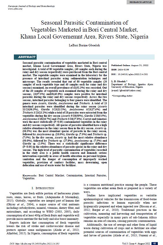 Seasonal Parasitic Contamination of Vegetables Marketed in Bori Central Market, Khana Local Governemnt Area, Rivers State, Nigeria