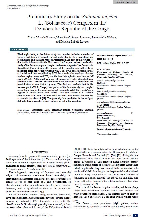 Preliminary Study on the Solanum nigrum L. (Solanaceae) Complex in the Democratic Republic of the Congo